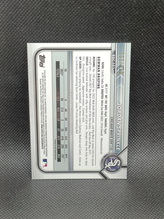 Jordan Sprinkle - 2022 Bowman Draft Chrome 1st Bowman Purple Refractor /250 - Chicago White Sox